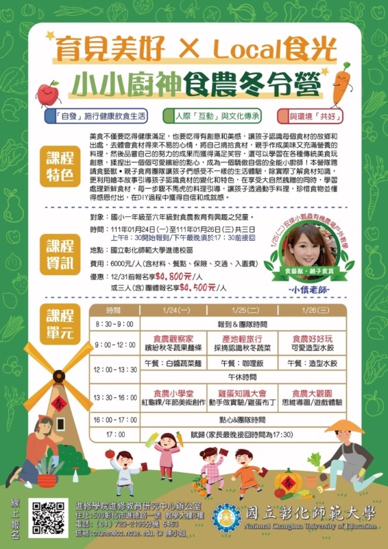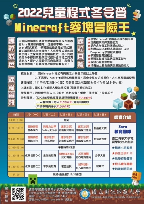 一、【2022兒童程式冬令營- Minecraft麥塊冒險王】:課程時間為111年01月24日(一)至01月28日(五)09:00-17:00(共5日,合計30小時),招生對象為對Microsoft程式有興趣之小學三年級以上學童,瞭解中英文切換操作、大小寫及滑鼠使用,無須具備Minecraft或程式相關基礎,課程費用每人11,000元(含材料費、餐費、保險費),12/24前報名享優惠9,500元/人、三人(含)以上團報9,000元/人(需同時繳費)或本校教職員子女9,000元/人,即日起受理報名至111年01月14日(五)止,如有課程相關問題,請逕向課程承辦人洽詢04-7232105分機5424 洪先生。 二、【育見美好 × Local食光】小小廚神食農冬令營:課程時間為111年01月24日(一)至01月26日(三)09:00-17:00(共3日),國小一年級至六年級對食農教育有興趣之兒童優先錄取,課程費用每人6,000元(含材料費、餐費、保險、交通、入園費),12/31前報名享優惠4,800元/人或3人(含)以上團報享4500/人,即日起受理報名至111年01月14日(五)止,如有課程相關問題,請逕向課程承辦人洽詢04-7232105分機5463 陳小姐。 三、報名步驟:線上報名,請至本校進修學院報名管理系統報名,如第一次報名,請先申請帳號 https://aps.ncue.edu.tw/cee/index.php。 四、更多課程相關資訊請參閱招生簡章(附件)。