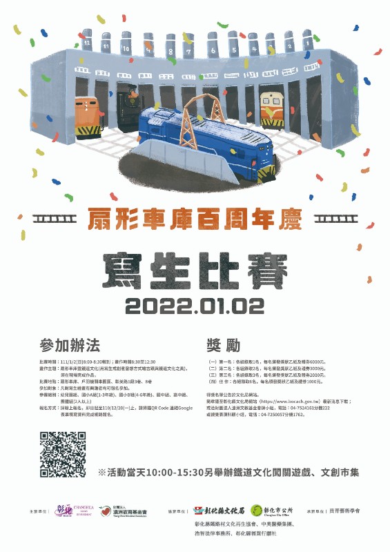 一、為慶祝彰化扇形車庫百週年慶,特訂於111年1月2日(日)於扇形車庫辦理寫生繪畫活動,培養親子互動、聯繫情感、建立溫馨和樂家庭。 ※ 報名方式:請於110年12月20日(星期一)以前,連結Google表單 https://docs.google.com/forms/d/e/1FAIpQLSfxbIyafyTW8jfKN7cVj-9tx8zEVzWJuP7gDvuV81eST7ApLw/viewform