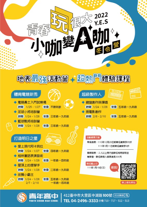 | 標題 | 臺中市青年高級中學辦理「2022Y.E.S青春玩很大小咖變A咖」冬令營 |
