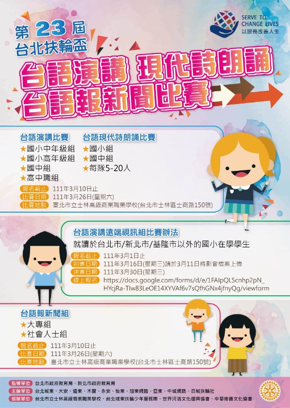 | 標題 | 轉知:台北城東扶輪社辦理「第二十三屆台北扶輪盃台語演講遠端視訊組比賽」活動辦法、報名表及海報各1份 |