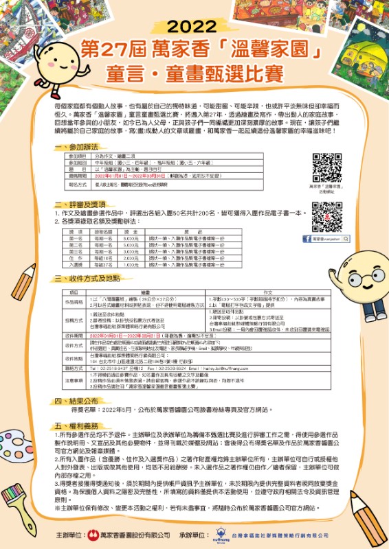 「萬家香溫馨家園童言童畫甄選比賽」,至今已邁入第二十七屆,希望藉由此活動的舉辦,讓學生細細品嚐家庭幸福的滋味,透過作文或繪畫的方式,將這幸福的滋味化成動人的篇章與美麗的圖畫。本次活動中,為了獎勵學生,繪畫組/寫作組將各選出前三名、佳作及入選作品,最高獎項可得到獎學金$8,000元及獎狀!同時也能獲得入圍作品集電子書檔案一份,獎項豐富,歡迎大家熱烈參與!附檔總共有四份,並依序說明:1.活動公文※此檔案為本次活動的正式公文。