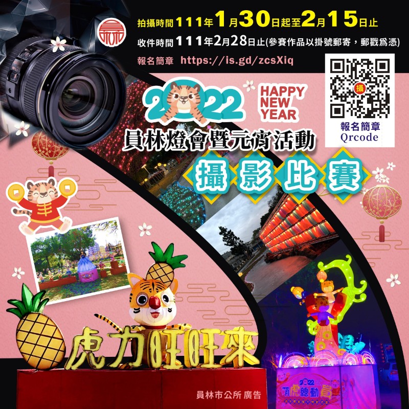 一、依據「2022員林燈會暨元宵活動」攝影比賽徵件簡章辦理。二、拍攝時間:作品限於111年1月30日起迄111年2月15日止;收件截止日期:111 年2月28日止(參賽作品以掛號郵寄,郵戳為憑);相關比賽內容請詳簡章。