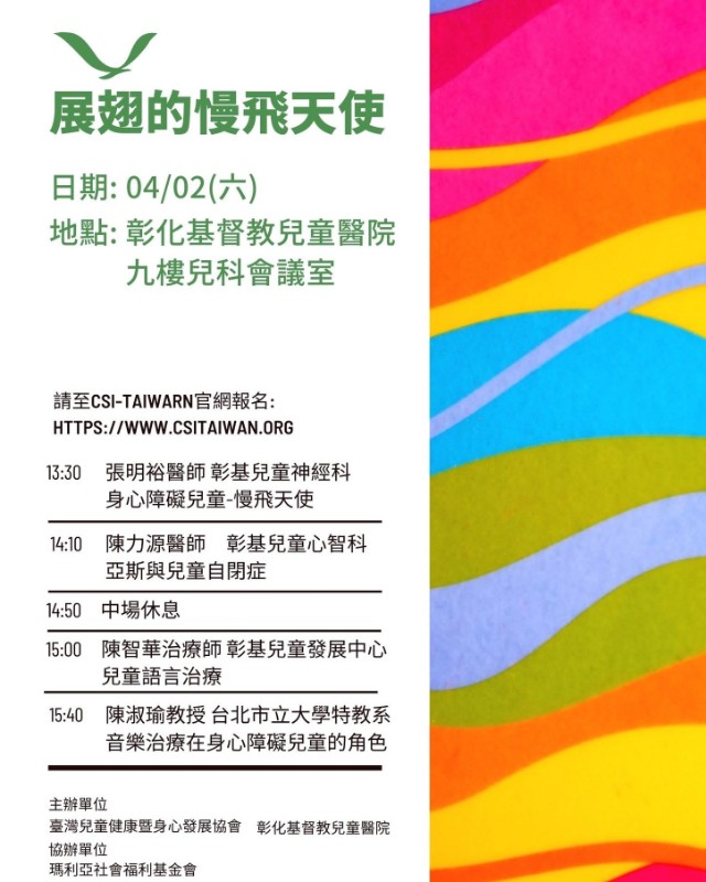 | 標題 | 轉知:社團法人臺灣兒童健康暨身心發展協會舉辦「兒童節活動—展翅的慢飛天使」活動資訊 |