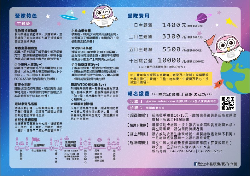 一、國立中興大學小貓頭鷹營擁有專業師資教學團隊、廣大有機生態校園及安全教學環境,課程結合理財、中醫、藝術、自然生態及烘培等多元主題課程,生動有趣激發創意,寒暑假安心託付的好去處!!
