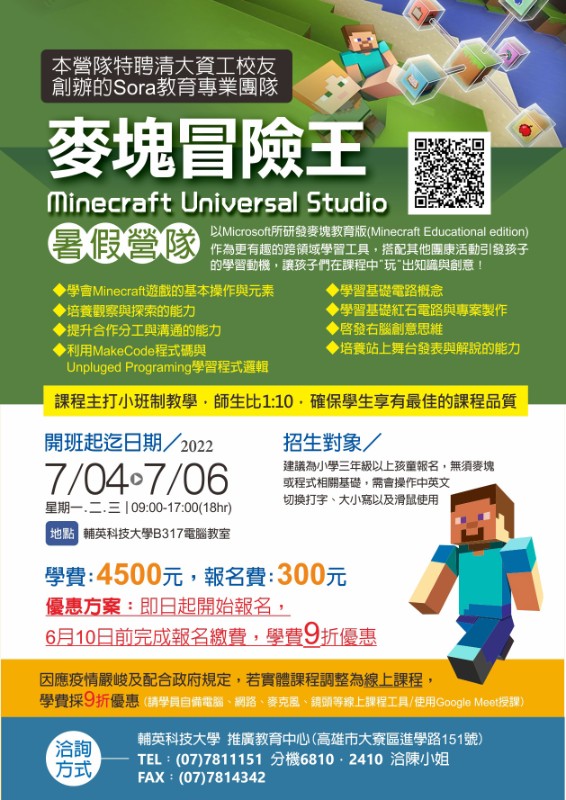 | 標題 | 輔英科技大學第110學年度推廣教育中心【麥塊冒險王(Minecraft Universal Studio) (三日營)】招生訊息 |