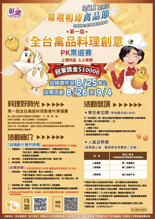票選及繪畫活動簡易資訊如下: (一)第一屆全台禽品料理創意PK 票選賽: 1、徵件時間:即日起至111年8月25日止。 2、票選時間:111年8月26日至111年9月4日。 3、參加對象:一般民眾。 4、徵件方式:採線上徵件報名(https://reurl.cc/bEkpDl)。 5、頒獎日期及地點:111年9月11日鹿港鎮體育場拱門前廣場(彰化縣鹿港鎮中正路531號)。 6、詳細資訊可參考活動E-DM或至票選活動網站(https://reurl.cc/bEkpDl)、「111年彰化禽品節」臉書粉絲專頁查詢。