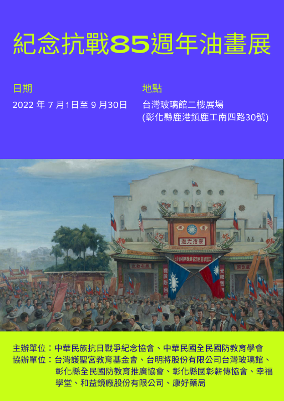主題:紀念抗戰爆發 85 週年油畫展。 地點:彰化台灣玻璃館。 展期:自即日起至111年9月30日止,展出的內容涵蓋我國對日抗戰的歷史,希望透過油畫的展出與介紹,使國人認識對日抗戰的艱辛歷史,傳承居安思危的全民國防教育。歡迎本縣各校師生家長前往參觀。
