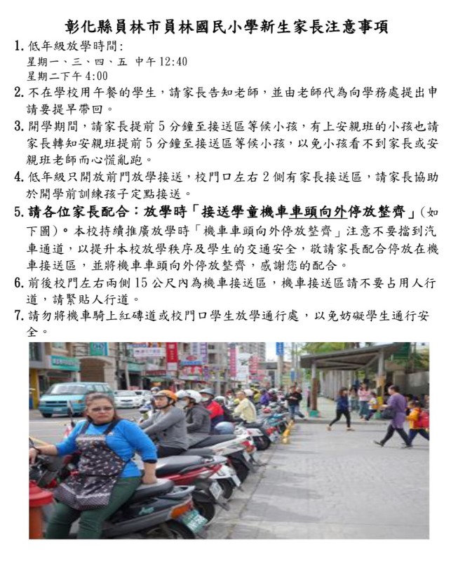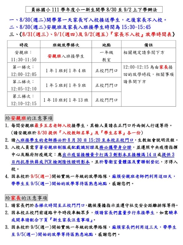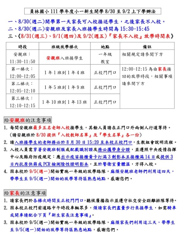 員林國小111學年度小一新生開學8/30(週二)至9/2(週五)上下學辦法