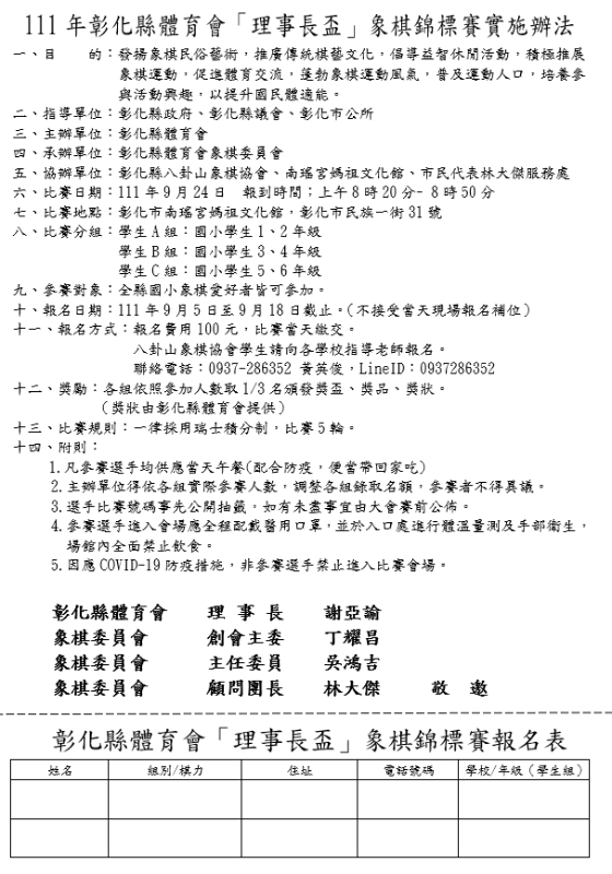 111年彰化縣體育會「理事長盃」象棋錦標賽實施辦法