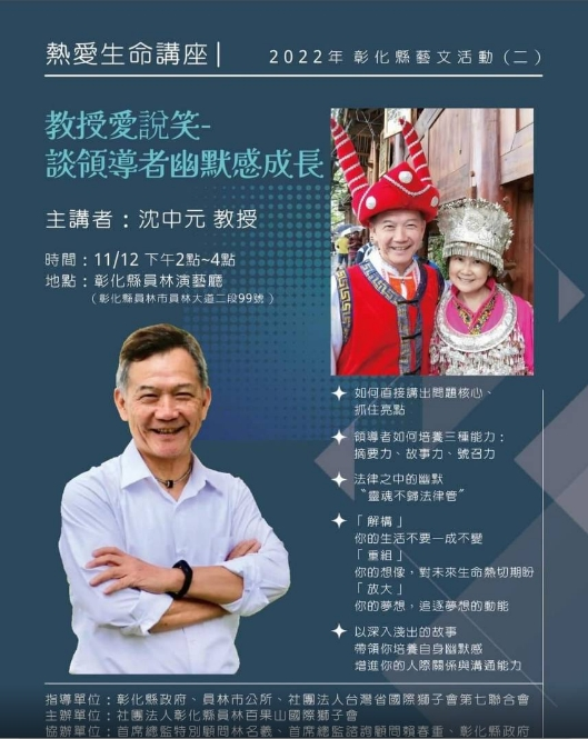 | 標題 | 轉知:2022年(11月12日星期六/下午)彰化縣藝文系列—熱愛生命講座「教授愛說笑-談領導者幽默感成長」 |