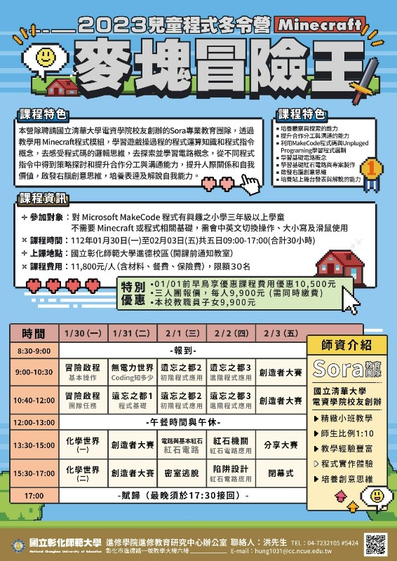 國立彰化師範大學進修學院推廣教育課程「2023兒童程式冬令營Minecraft麥塊冒險王」招生簡章