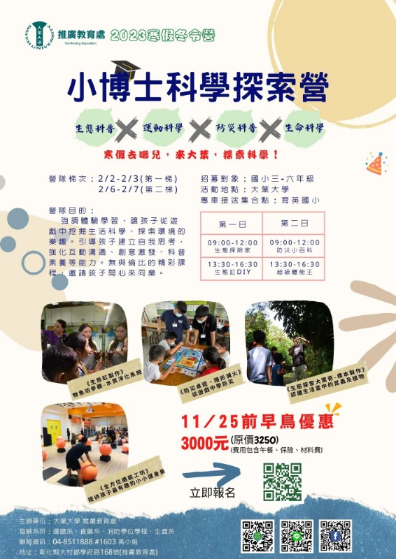 轉知:大葉大學推廣教育處辦理「小博士科學素養營」招生簡章乙份 |