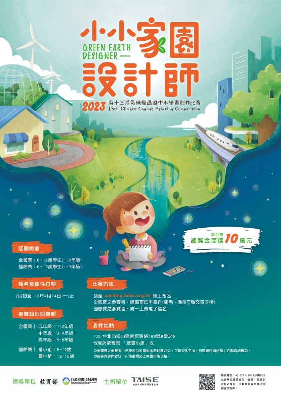 一、由教育部、行政院環境保護署指導,財團法人台灣永續能源研究基金主辦之「氣候變遷國中小繪畫創作比賽」迄今已舉辦12屆,累計40國、59,152名學子參與。本屆(第13屆)為呼應聯合國永續發展目標(SDGs)的第11項,以「小小家園設計師」為主題,提升國中小師生關注天然災害對城市造成的損傷,思考如何降低城市垃圾和空氣污染,同時重視社區文化與自然遺產等。此繪畫比賽也呼應第13項,採取氣候行動並提升大眾相關意識。 二、報名日期:112年2月7日(二)至112年4月24日(一)止。為鼓勵師生參與,獲獎師生可分別獲頒獎狀及感謝狀。本屆比賽總獎金高達新臺幣10萬元,獲獎作品也有機會在「台北捷運藝文廊」、「高雄新光三越左營店」展出。更多比賽資訊請至活動網站查詢(https://painting.taise.org.tw)。 三、若教師將本活動融入環境教育課程,其可至行政院環境保護署環境教育終生學習網(elearn.epa.gov.tw)申請開課,並於課後登錄師生實際學習時數,取得環境教育時數,敬請踴躍參與。