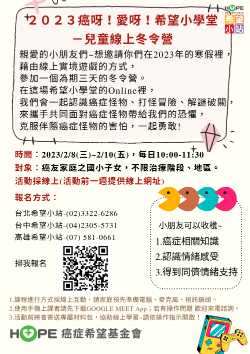 | 標題 | 「2023年兒童線上冬令營_癌呀愛呀之希望小學堂」活動 |