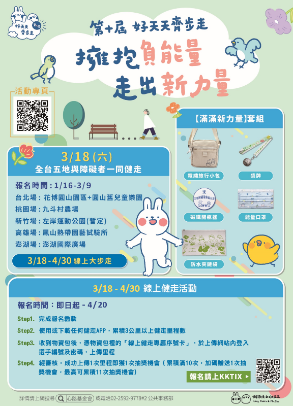 一、依據財團法人心路社會福利基金會112年2月18日心路(112)字第1120000061號辦理。 二、第十屆「好天天齊步走」實體健走活動: (一)活動日期:112年3月18日(星期六)上午。 (二)活動地點:五地同步進行,請依所在地擇一處報名即可台北—花博圓山園區及圓山舊兒童樂園、桃園—九斗村農場、新竹—左岸運動公園、高雄—鳳山熱帶園藝試驗所、澎湖—澎湖國際廣場。 四、贊助「好天天齊步走」活動經費:為鼓勵障礙者參與,領有身心障礙證明者與1位陪同者可享免費優惠。其餘不分年齡參與上述實體健走或線上健走活動,基本報名費用300元/人,可獲得紀念獎牌1個、線上健走專屬序號卡1張。可額外加購義賣品(附件一),【來點新力量組】550元,除基本紀念品外,並有磁鐵開罐器、防水夾鏈袋、口罩(3片一組);【滿滿新力量組】850元,則再增加電繡旅行小包1個。所得費用都將作為心路基金會智能障礙服務經費。報名任一場次實體健走活動,即有線上健走活動參加資格,勿須重複報名。