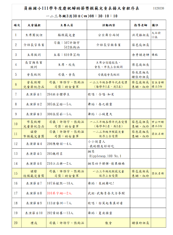 三程序表:(員林國小111學年度慶祝婦幼節暨模範兒童表揚大會程序表)