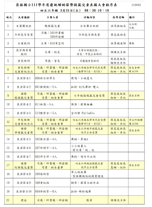 員林國小111學年度慶祝婦幼節暨模範兒童表揚大會程序表一、時間:123年級表揚大會 3/30(四)456年級表揚大會 3/31(五)