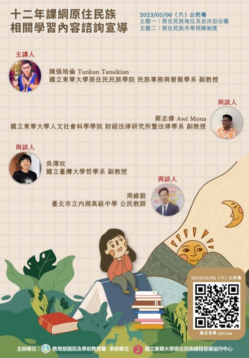 | 標題 | 轉知:教育部國民及學前教育署委請國立東華大學原住民族課程發展協作中心辦理「十二年課綱原住民族相關學習內容諮詢宣導-公民場次歷史場次研習」之諮詢宣導活動 |