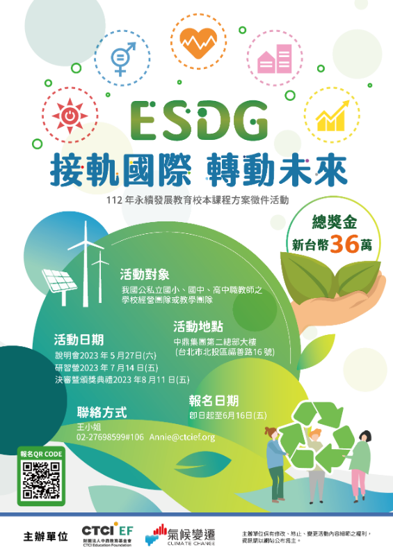 強化我國教育人員對於永續發展教育(ESD)與聯合國永續發展目標(SDGs)的認識,並了解國際上正在發生的新趨勢:ESD+SDG=ESDG,以此思維與框架設計校本位課程,接軌國際趨勢,發揮學校特色,並將SDGs融入校本課程,呼應全球與在地關鍵永續發展議題,提昇全校師生之永續發展素養。中鼎教育基金會(CTCI EF)與教育部氣候變遷教育計畫共同籌辦「ESDG接軌國際、轉動未來-112年永續發展教育校本課程方案徵件活動」。 |