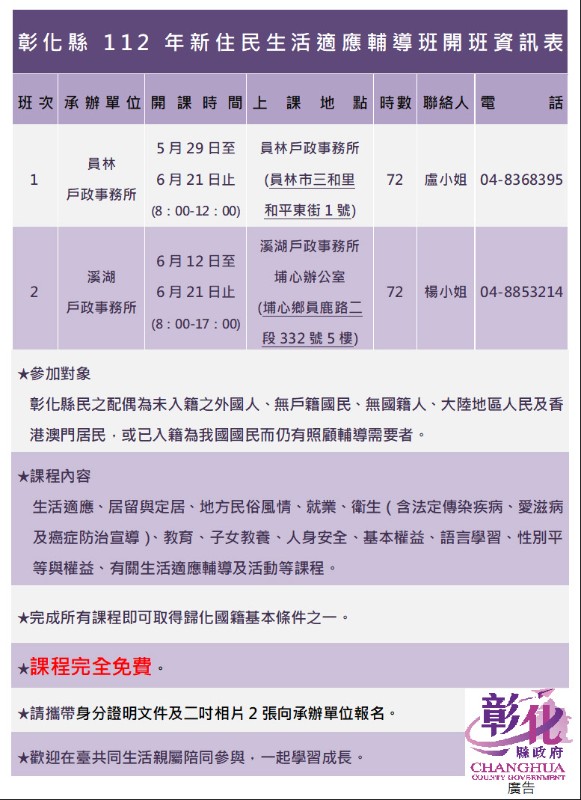 轉知:彰化縣112年新住民生活適應輔導班開班資訊(修正資料),鼓勵有興趣家長踴躍報名參加