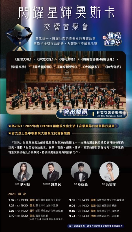 說明: 一、節目介紹:字裡行間有詩、弦律跌宕亦如詩。電影,是諸多畫面的層層堆砌。盛夏,狂美將從萬千奧斯卡電影提名與得獎作品中,揀選不同元素,與導聆吳怡霈以樂章協力呈現九部電影史詩的壯闊恢弘。最終將邀請觀眾擔任評委,「投票」選出本場最佳演繹,你我都是盛典要員,聽覺與互動交織的音樂會,不容錯過。 二、演出時間及地點: (一)臺中-臺中國家歌劇院大劇院 07/07(五) (二)臺北-臺北市中山堂中正廳 07/21(五) (三)新竹-新竹縣政府文化局音樂廳 08/05(六) (四)臺北-國家音樂廳 08/10(四) (五)嘉義-嘉義市政府文化局音樂廳 09/02(六)