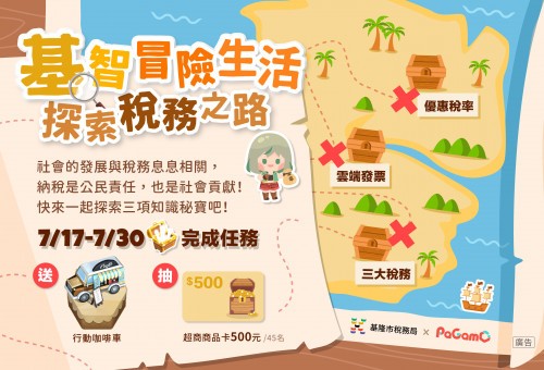 一、依據基隆市稅務局(以下簡稱該局)112年7月19日基稅服貳字第1120100171號函辦理。 二、該局透過PaGamO線上學習平台舉辦「基智冒險生活」線上學習活動,邀請全國國中、國小學生參加,透過回答租稅問題搶攻領地。 三、旨揭活動日期:自112年7月17日至7月30日。 四、活動詳請,請參閱該局FB貼文,連結網址為:https://reurl.cc/lDMgEQ。 五、檢附活動海報1份。