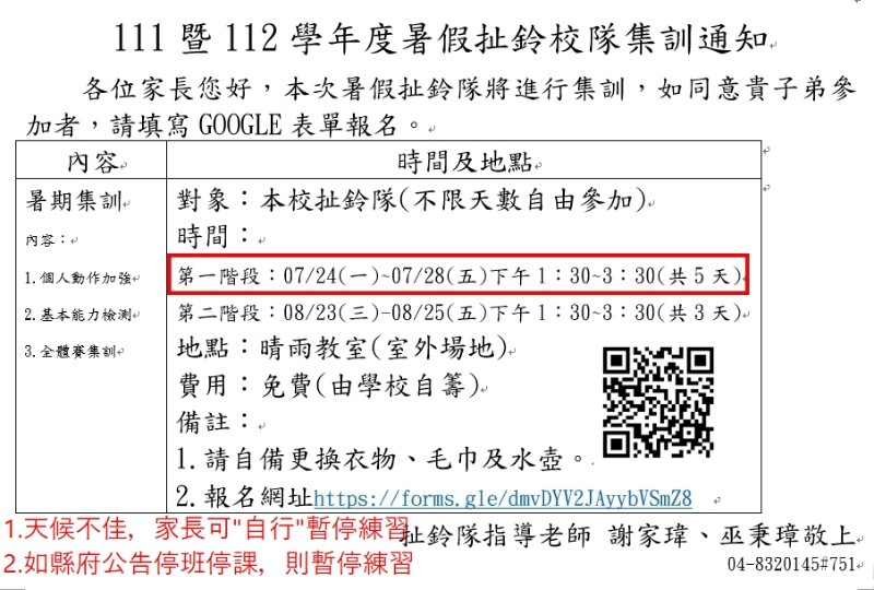 | 標題 | 扯鈴隊集訓通知:7/24-7/28下午1:30-3:30,如遇天候不佳,家長可自行暫停練習。 |
