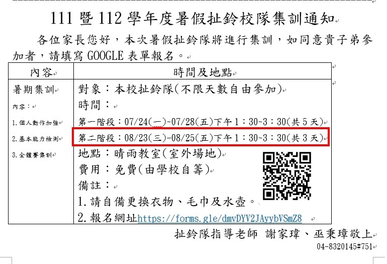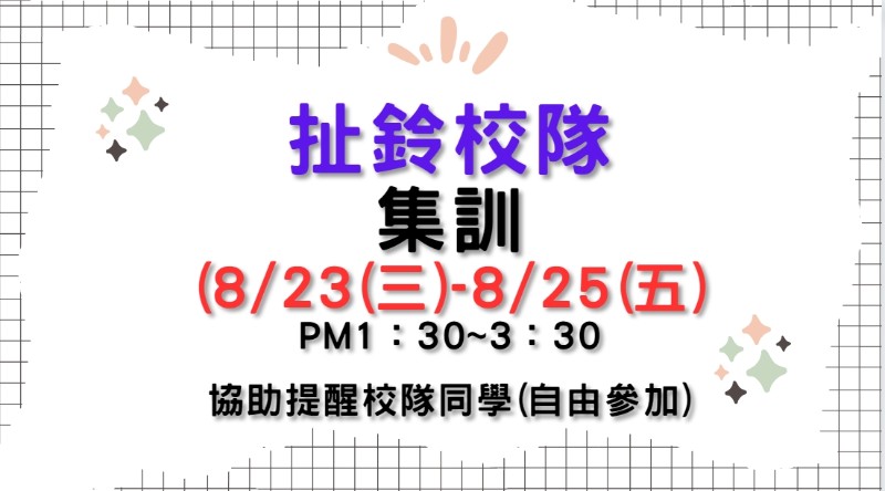 轉知:扯鈴校隊集訓8/23(三)~8/25(五)下午1:30~3:30