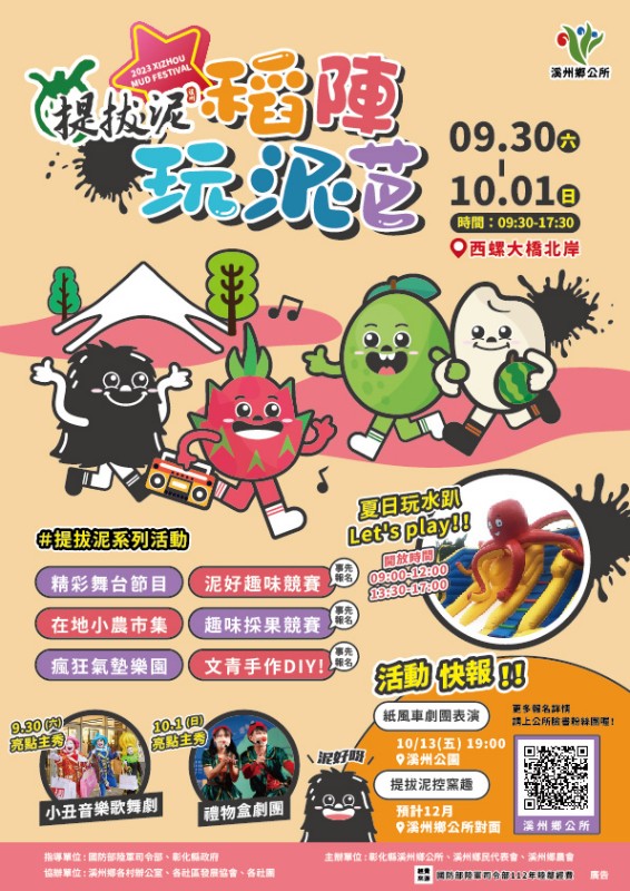 一、「2023溪州提拔泥-稻陣玩泥芭」活動將於112年09月30日(六)、10月01日(日)在溪州西螺大橋北岸活力登場,活動現場除了小丑音樂歌舞劇、禮物盒劇團、歡樂泡泡秀、折氣球秀等精彩舞台節目外,還有手作體驗、泥好趣味競賽、趣味採果競賽、瘋狂氣墊遊戲區、小農文創市集等系列活動。 二、系列活動一:10月13日(五)於溪州公園邀請紙風車兒童劇團演出巫頂環遊世界、系列活動二:12月於溪州公所前農地辦理提拔泥爌窯趣。 三、活動詳情請至fb搜尋【溪州鄉公所】粉絲專頁,隨時掌握最新消息,如有異動依網站公告為準。