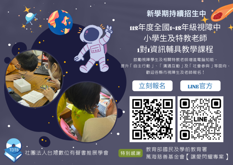說明: 一、依據社團法人台灣數位有聲書推展學會112年9月14日台有聲書字第1120000044號函辦理。 二、為能協助視障學子克服障礙,未來於就學、就業等層面獲得更公平之機會,本學會於112年獲國教署補助辦理「向下紮根、向上提升─視障中小學生資訊教育計畫」及萬海航運慈善基金會「打開通往未來的大門─視障者資訊與寫作表達培力計畫」,針對全國就讀於1~12年級領有身心障礙手冊之視覺障礙學生、其家長及特教或巡輔老師,提供一對一實體或遠距電腦教學。 |