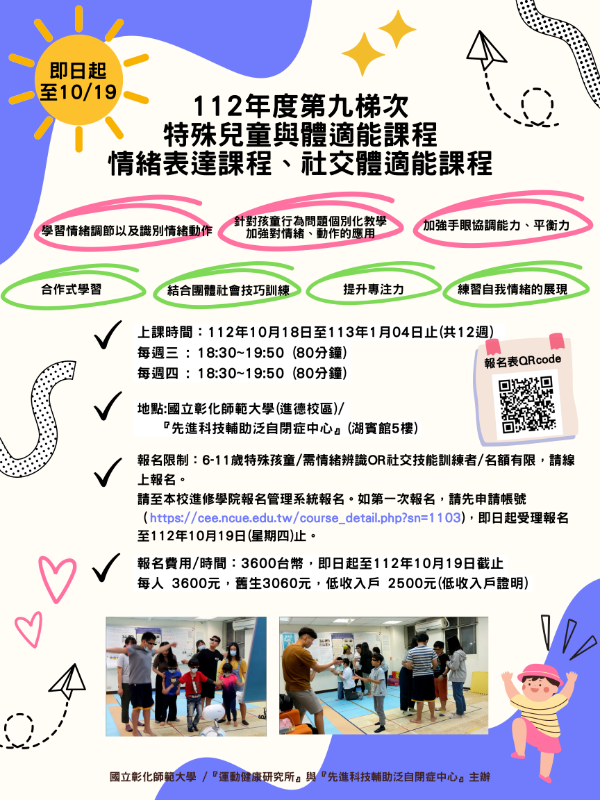 | 標題 | 轉知:國立彰化師範大學「先進科技輔助泛自閉症中心」辦理「特殊兒童與體適能課程-情緒表情課程、社交體適能課程」之課程,歡迎踴躍報名參加。 |