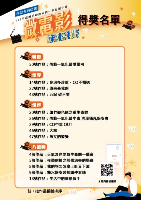 共 14 件得獎影片,請多加點閱,增加防範熱水器一氧化碳中毒之知能 https://www.nfa-comicromovie.com.tw/awardwinners/ 附件為得獎名單宣傳圖卡。