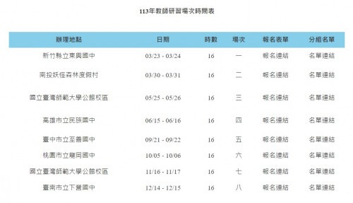 一、依據國立臺灣師範大學113年2月16日師大化學字第1131003954號函辦理。 二、研習資訊: (一)第一場次新竹場:113年3月23日(星期六)至3月24日(星期日);研習地點:新竹縣立東興國中;報名連接:https://forms.gle/PZVEW6yZq93uLFjC9。 (二)第二場次南投場:113年3月30日(星期六)至3月31日(星期日);研習地點:妖怪森林渡假村;報名連接:https://forms.gle/re5NrUGyWtpafzZf7。 (三)第三場次師大1場:113年5月25日(星期六)至5月26日(星期日);研習地點:國立臺灣師範大學公館校區;報名連接:https://forms.gle/B49MSNDVbgDv67w29。 (四)第四場次高雄場:113年6月15日(星期六)至6月16日(星期日);研習地點:高雄市立民族國中;報名連接:https://forms.gle/DXD1KMEw7gKMkTeF7。 (五)第五場次臺中場:113年9月21日(星期六)至9月22日(星期日);研習地點:臺中市立至善國中;報名連接:https://forms.gle/4W2pup5tBRu9Lain8。 (六)第六場次桃園場:113年10月5日(星期六)至10月6日(星期日);研習地點:桃園市立龍岡國中;報名連接:https://forms.gle/k4bbGnpZpjuGnTkh6。 (七)第七場次師大2場:113年11月16日(星期六)至11月17日(星期日);研習地點:國立臺灣師範大學公館校區;報名連接:https://forms.gle/iJiq9N9rxEbWftnw5。 (八)第八場次臺南場:113年12月14日(星期六)至12月15日(星期日);研習地點:臺南市立下營國中;報名連接:https://forms.gle/HTUz3ydUn3rFK7Bd8。 三、研習時間:上午8:30至下午5:30。 四、參加對象:全國22縣市國中小學自然學科教師。 五、報名方式:皆採取網路方式報名。 六、每場次研習完畢後,承辦單位將依據教師實際出席情況核發至多16小時的研習時數。 七、相關研習資訊請至該國立臺灣師範大學學教育中心網站查詢:https://www.sec.ntnu.edu.tw/zh_tw/moe/enhance。 八、檢附113年場次規劃表及課程表各1份。 九、本案相關事宜請逕洽韓欣倫專任助理,聯絡電話:0958-061-000。