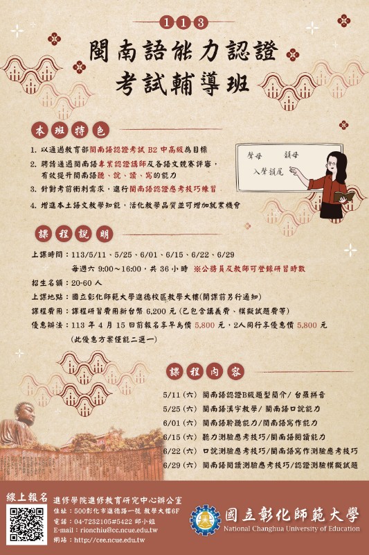 | 標題 | 轉知:國立彰化師範大學進修學院推廣教育課程「113年閩南語能力認證考試輔導班」課程簡章 |