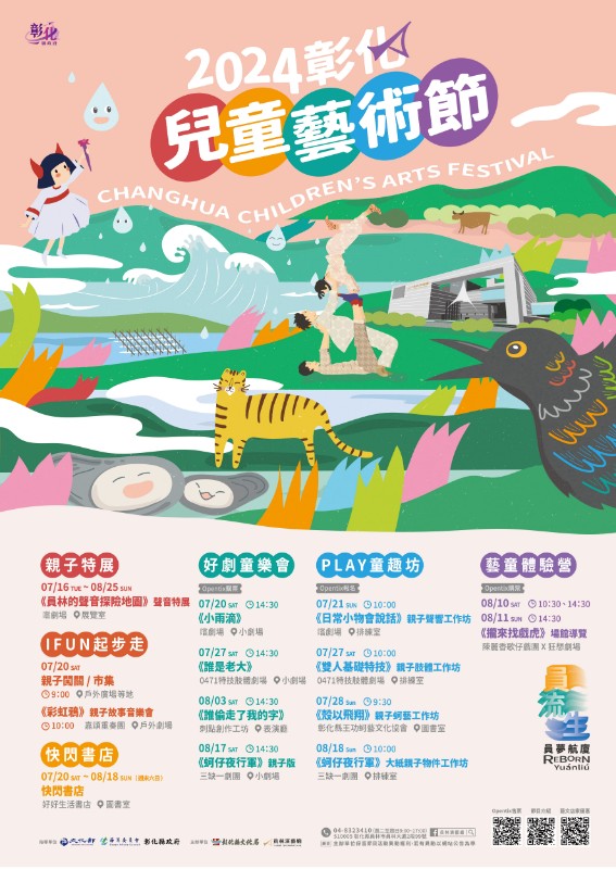 一、本局為推廣優質表演藝術節目,每年暑假推出「彰化兒童藝術節」,已成為縣內大朋友及小朋友引領期盼的視聽藝文饗宴。今藝術節系列活動將從7月16日至8月25日於員林演藝廳展開,由嚐劇場、0471特技肢體劇場、刺點創作工坊、三缺一劇團、陳麗香歌仔戲團、嘉頌重奏團等優質團隊帶來擬音默劇、特技馬戲、原創音樂劇、環境生態主題演出、場館導覽及故事親子音樂會等,6檔好戲、工作坊、場館體驗,另外1場免費戶外開幕活動及為期6週免票入場的《員林的聲音探險地圖》聲音特展,圖書室也有快閃書店、主題書展等,內容豐富多元,非常適合一般民眾及親子共襄盛舉。 二、檢附「2024彰化兒童藝術節」活動海報