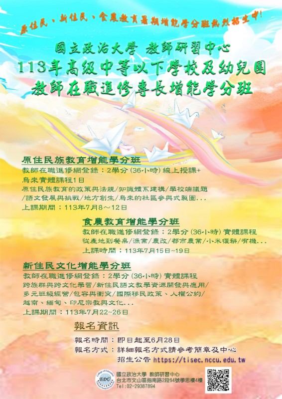 一、依據國立政治大學113年6月4日政院教研字第1130018241號函辦理。 二、教育部為依12年國教總綱明訂各領域課程設計應適切融入19項重要議題,以及其他涉重要政策之新興議題規劃增能學分班,補助國立政治大學教師研習中心辦理旨揭學分班,共有「原住民族教育」、「新住民教育」及「食農教育」3班次。 三、旨揭學分班招生對象: (一)高級中等以下學校及幼兒園合格在職專任教師。 (二)具高級中等以下學校及幼兒園合格教師證書,且聘期為三個月以上之在職代理、代課或兼任教師。 (三)於高級中等以下學校及幼兒園任教,且聘期為三個月以上,並符合就業服務法規定資格之該科外籍之在職教師。服務法規定資格之該科外籍之在職教師。 四、符合上述資格之教師修畢本課程全部增能學分且成績及格者,登記教師在職進修網研習時數。 五、旨揭學分班學費由教育部全額補助,尚有招生名額。 六、網路報名登錄至113年6月28日13:00止,請至國立政治大學教師研習中心網頁登錄報名( http://tisec.nccu.edu.tw ),詳細資訊請參閱所附簡章內容或至國立政治大學教師研習中心網頁查詢。聯絡電話:(02)2938-7894。