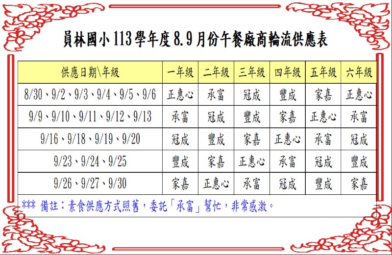 員林國小113學年度8-9月午餐廠商供餐輪流表