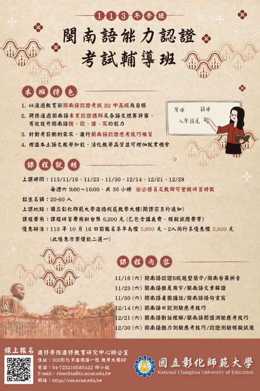 轉知:彰化師範大學進修學院推廣教育課程「113年閩南語能力認證考試輔導班(冬季班)」