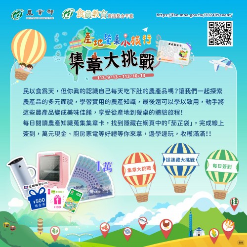 | 標題 | 農業部食農教育資訊整合平臺預訂於113年9月13日至10月13日辦理「產地到餐桌小旅行 集章大挑戰」食農教育推廣活動,請踴躍鼓勵親、師、生參與活動 |
