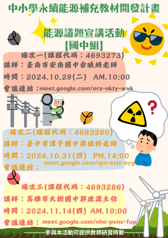 國立高雄師範大學辦理「國中小線上能源議題宣講」各三場,請鼓勵教師踴躍參加,請查照。 單位 / 發佈人 體健科 / 鄭純君 時間 / 點閱 2024-10-14 11:12 / 156 內容 一、依據國立高雄師範大學113年10月11日高師大工教字第1131008868號函辦理。 二、辦理單位:國立高雄師範大學工業科技教育學系。 三、「線上能源議題宣講」活動講師,時間及日期,詳細如下: (一) 【國小組】場次一 (課程代碼:4617316);講師:臺中市翁子國小楊宗榮主任;時間:113年10月17日(星期四) 下午13:30至15:00;Google Meet連結:meet.google.com/xdo-kafh-foe。 (二) 【國小組】場次二 (課程代碼:4693255);講師:臺中市長億國小莊秋蘭老師;時間:113年10月25日(星期五) 上午09:30至11:00;Google Meet連結:meet.google.com/ayg-ppcz-yry。 (三) 【國小組】場次三 (課程代碼:4693262);講師:高雄市左營國小郭晴之老師;時間:113年11月13日(星期三) 下午14:00至15:30;Google Meet連結:meet.google.com/ycd-qrxa-fem。 (四) 【國中組】場次一 (課程代碼:4693273);講師:臺南市安南國中余曉綺老師;時間:113年10月29日(星期二) 上午10:00至11:30;Google Meet連結:meet.google.com/erz-nkty-wxk。 (五) 【國中組】場次二 (課程代碼:4693280);講師:臺中市潭子國中梁瑞秢老師;時間:113年10月31日(星期四) 上午14:00至15:30;Google Meet連結:meet.google.com/rpx-zyjc-syg。 (六) 【國中組】場次三 (課程代碼:4693286);講師:高雄市大樹國中郭政源主任;時間:113年11月14日(星期四) 上午10:00至11:30;Google Meet連結:meet.google.com/nho-pvnv-fup 四、全程參與課程將核發研習時數2小時;未全程參與者,將不核予研發時數。