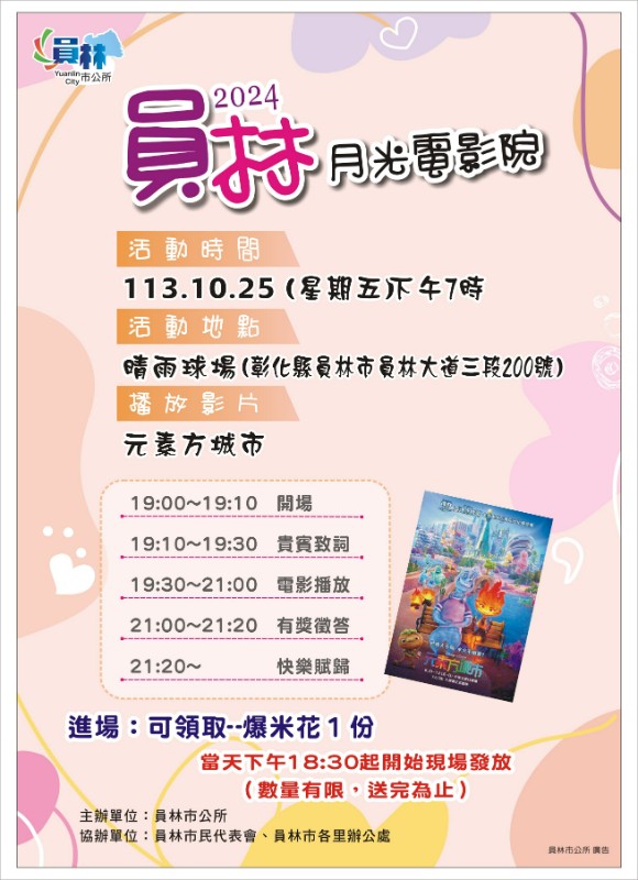 員林市公所為歡慶萬聖節,特舉辦「2024員林月光電影院」活動, 播放動畫影片―《元素方城市》,期與市民創造愉悅的一夜。 活動資訊如下: (一) 日期:113年10月25日(星期五)下午7時。 (二) 地點:晴雨球場(本市員林大道三段200號)。 (三) 現場於進場時(下午6時30分)每人可領取爆米花1份,數量有限,送完為止。