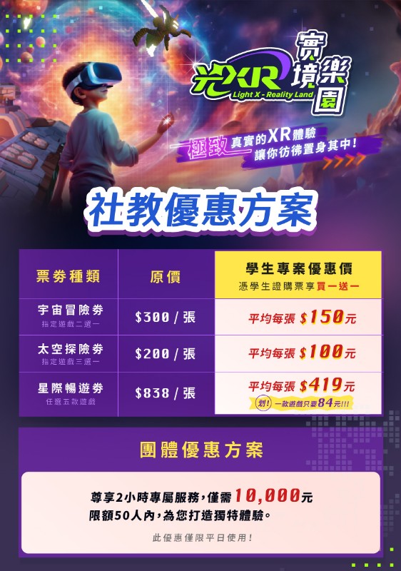 一、依據臺北市政府教育局113年10月21日北市教終字第1133103135號函辦理。二、臺北大眾捷運股份有限公司受臺北市政府教育局委託經管臺北市立兒童新樂園,為嘉惠學子,該公司特邀協力廠商共同推廣,提供小學及中學校園專屬優惠,歡迎各校學生及校外教學前來體驗新科技。三、相關優惠資訊請洽詢服務專員楊先生(連絡電話:0958-233183)。四、檢附兒童新樂園光XR實境樂園社教優惠方案電子檔1份。