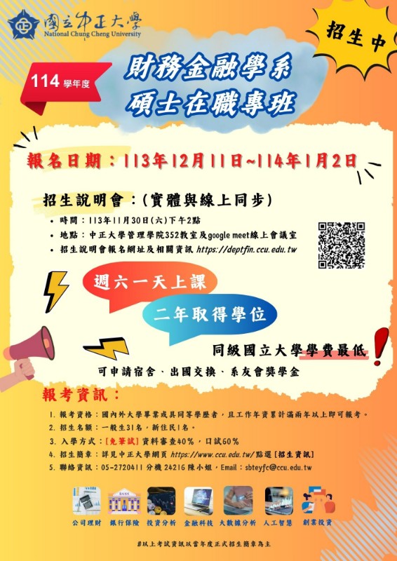轉知:中正大學財務金融學系碩士在職專班114學年度招生宣傳訊息