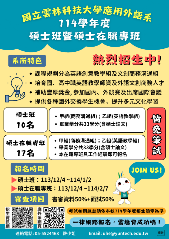 轉知:雲林科技大學應用外語系114學年度碩士班暨在職專班招生資訊