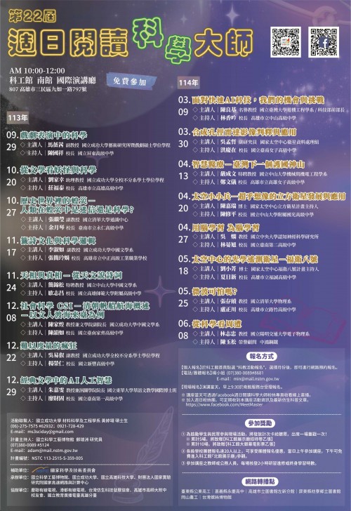 一、依據國立科學工藝博物館113年12月30日館教字第1136263859號函辦理。 二、「週日閱讀科學大師」講座目的為引發學生及社會大眾對於科學的理解、興趣及參與,以增進其科學素養,是專為年輕朋友與社會大眾在週日上午舉辦的科普講座。 三、114年3月至114年6月份講座場次表及海報,如附件,演講地點於國立科學工藝博物館南館國際演講廳,每場講座亦核發參加教師2小時研習時數,以及參加公務人員核予2小時進修時數,本講座亦提供現場直播,歡迎透過週日閱讀科學大師官網http://science.nchc.org.tw/web即時收播。 四、本講座為免費進場,亦歡迎各級學校師生安排團體利用假日舉辦「科工館一日遊」,上午至該館聽講座「閱讀」科學大師的智慧,下午則可免費進入科工館「參觀」精彩互動的常設展示廳。團體報名請洽專線:07-3800089轉分機8681,E-mail:min@mail.nstm.gov.tw。 五、講座詳細內容及報名方式等相關訊息請查閱官網。