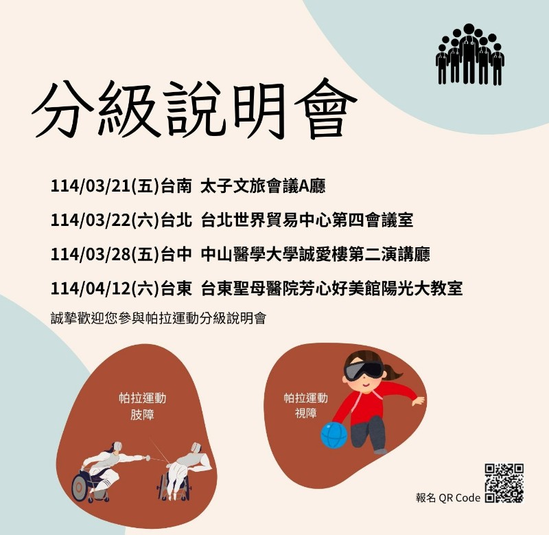 一、依據新北市政府體育局114年3月19日新北體全字第1140503621號函辦理。 二、旨揭說明會時間及地點: (一) 114年3月21日(星期五)下午2時30分,假太子文旅會議A廳。 (二) 114年3月22日(星期六)上午10時整,假台北世界貿易中心第四會議室。 (三) 114年3月28日(星期五)下午2時30分,假中山醫學大學誠愛樓第二演講廳。 (四) 114年4月12日(星期六)上午10時整,假台東聖母醫院芳心好美館陽光大教室。 三、檢附114年帕拉運動分級說明會簡章及海報各1份。