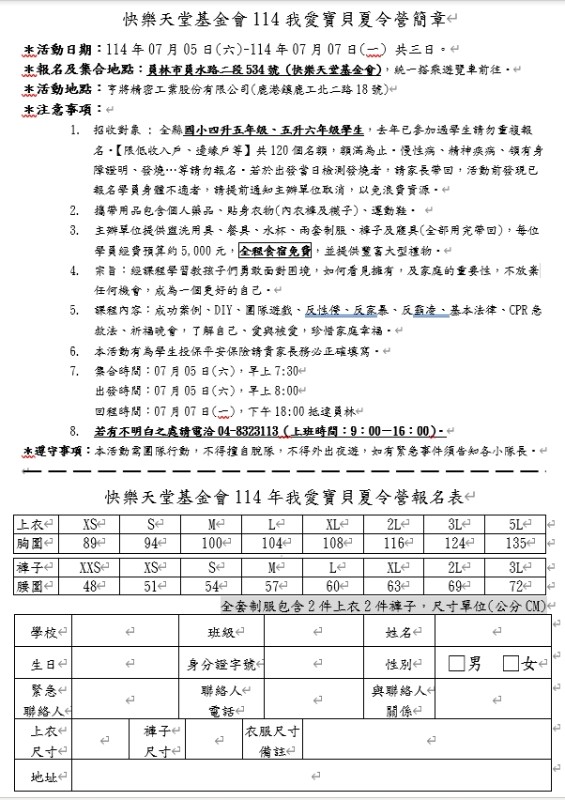 快樂天堂基金會114我愛寶貝夏令營簡章(限 四、五年級低收入戶學生報名) |