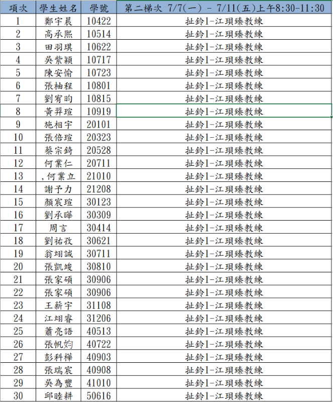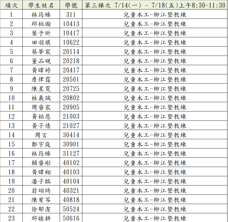 各位同學與家長好: 訓育組公布目前暑假社團已招生額滿的名單,請參閱下列檔案。 目前已額滿的社團為:第二梯次上午 扯鈴1,第三梯次上午 兒童木工 魔幻科學1,第三梯次下午直排輪3, 如尚有意願報名者,請盡速報名其他未額滿社團,謝謝您。
