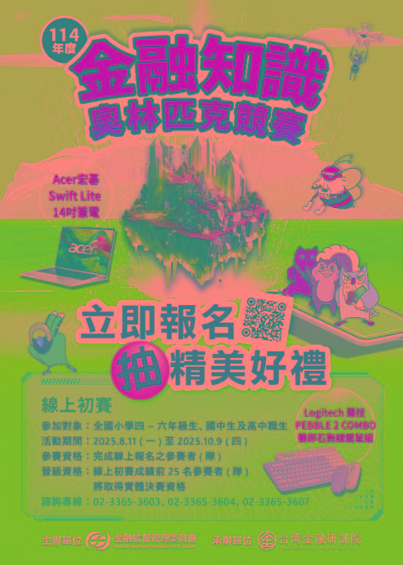 | 1、參加對象:全國國中、高中職一至三年級學生。 2、線上初賽期間:114年8月11日至10月9日。 3、活動方式:分為國中個人組、國中團體組、高中 職個人組、高中職團體組,線上初賽後擇優進入 實體決賽。 |