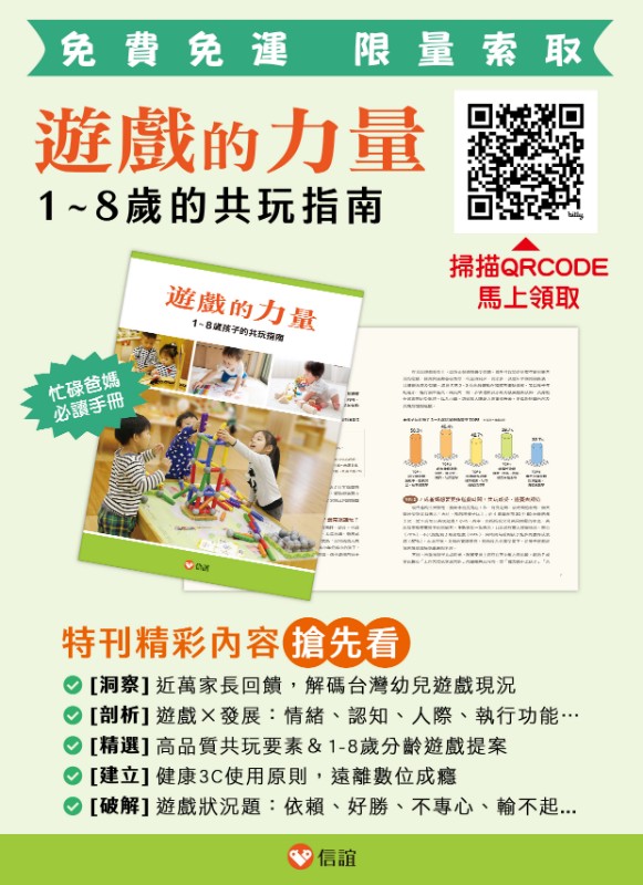 主旨:信誼基金會出版《遊戲的力量:1-8歲孩子的共玩指南》特刊,即日起提供【免費免運贈送】,歡迎 線上索閱。 說明: 一、信誼基金會為關心國內幼兒遊戲行為與發展,透過網路調查邀請家長分享觀察,共收集9,981份有效數據,進一步分析歸納2-8歲居家遊戲、友伴互動及3C使用等現況,並邀請腦科學、心理學與幼教等專家解讀遊戲背後的發展密碼,編纂《遊戲的力量:1-8歲孩子的共玩指南》特刊,深入探討遊戲經驗對各階段成長的重要性,亦提供分齡引導策略與常見問題解決方案。 二、《遊戲的力量:1-8歲孩子的共玩指南》特刊以協助家長和照顧者提升共玩與互動的品質,讓孩子玩出成長關鍵力為主要目標,是現代父母提高遊戲效能、增加共玩靈感的必讀實用手冊。即日起,開放【免費免運索取】敬請轉知 貴校家長 線上索閱: https://bit.ly/3HqXvp6 三、《遊戲的力量:1-8歲孩子的共玩指南》特刊精彩內容: ‧[洞察]近萬家長回饋,解碼台灣幼兒遊戲現況 ‧[剖析]遊戲×發展:情緒、認知、人際、執行功能… ‧[歸納]高品質共玩要素,協助爸媽提高遊戲效能 ‧[收錄]1-8歲分齡遊戲提案,育兒靈感隨翻即用 ‧[建立]健康3C使用原則,遠離數位成癮 ‧[破解]遊戲狀況題:依賴、好勝、不專心、輸不起... 四、免運免費索取網址:https://bit.ly/3HqXvp6